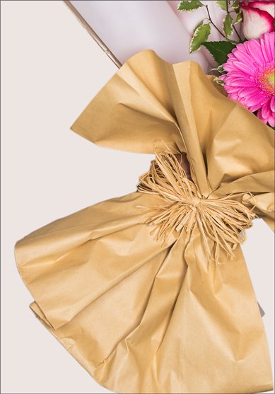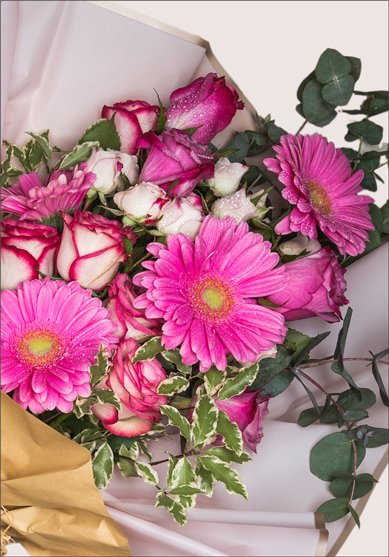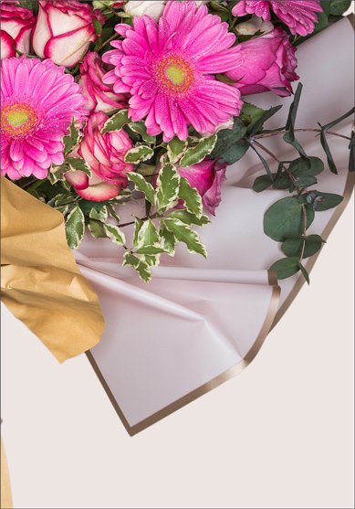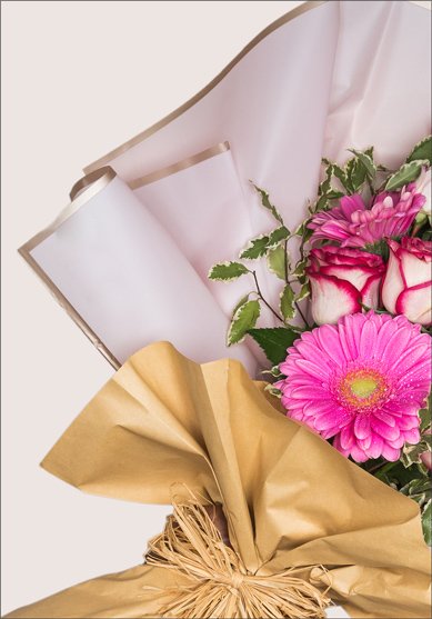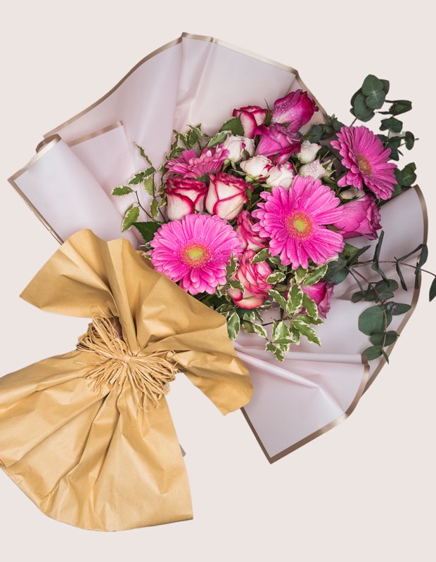 Dreamland is a bouquet of O’Hara roses, bombastic roses, and gerberas in offwhite and brown wrapping paper.