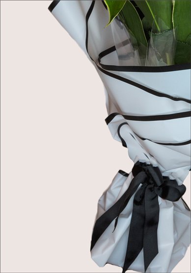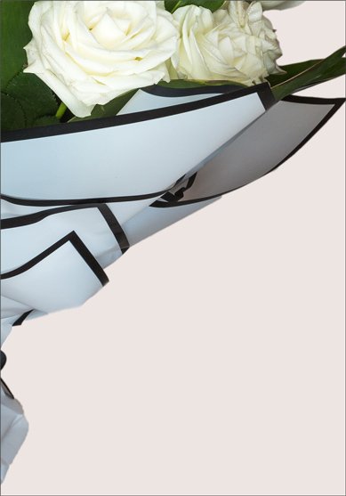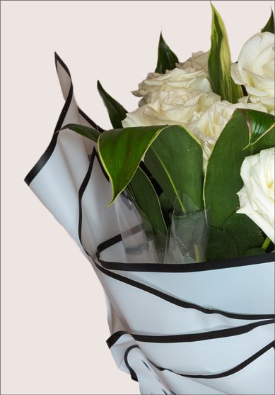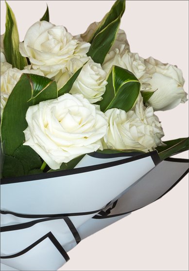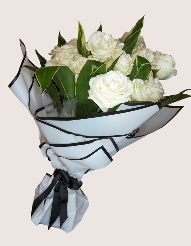 Roman Holiday is a bouquet of a dozen white roses and some green cordylines in special white wrapping paper.